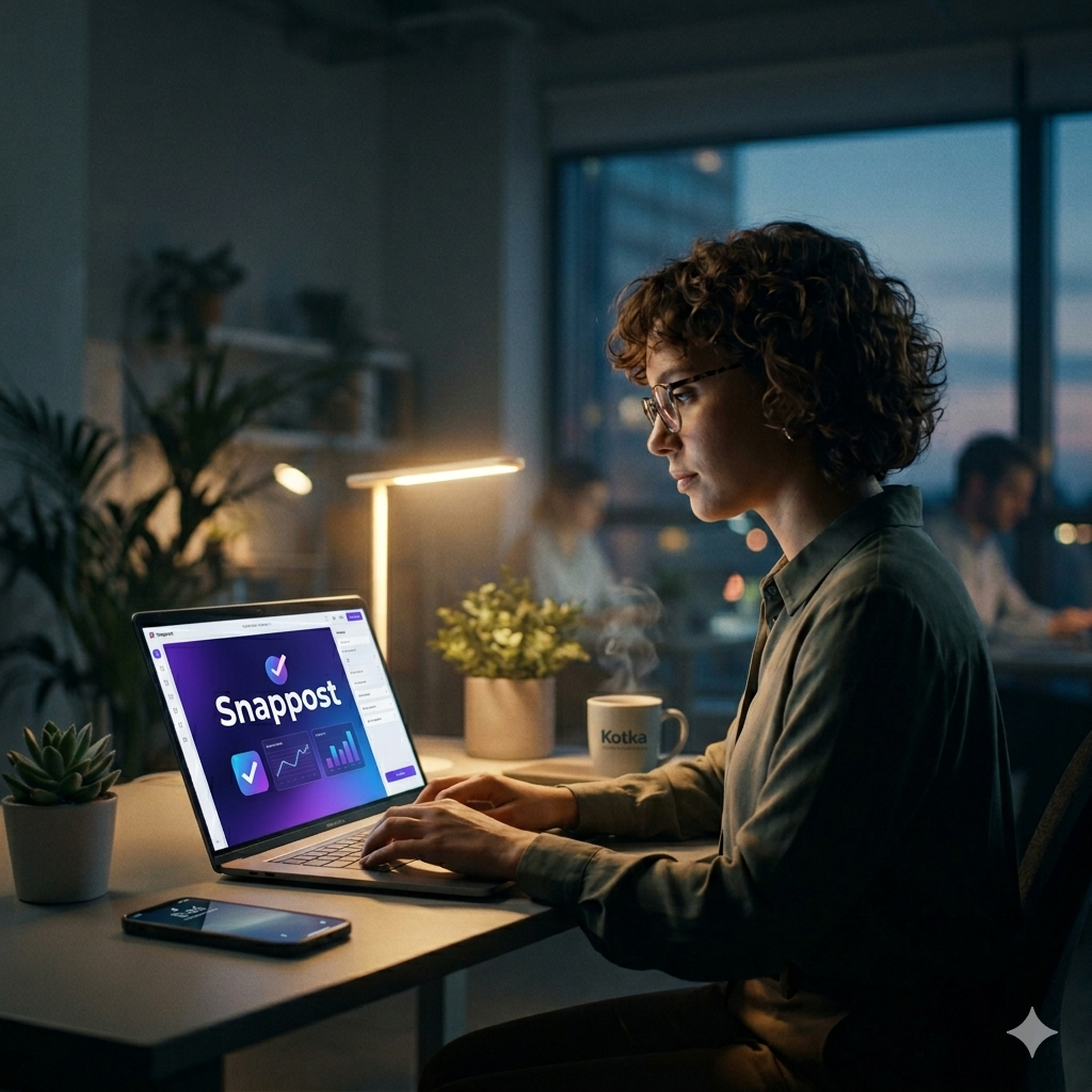 Tabii, isteğiniz üzerine Snappost’un modern ve yenilikçi yapısını, daha soyut ve fütüristik bir dille anlatan, bir önceki görselden tamamen farklı bir kompozisyon oluşturdum.